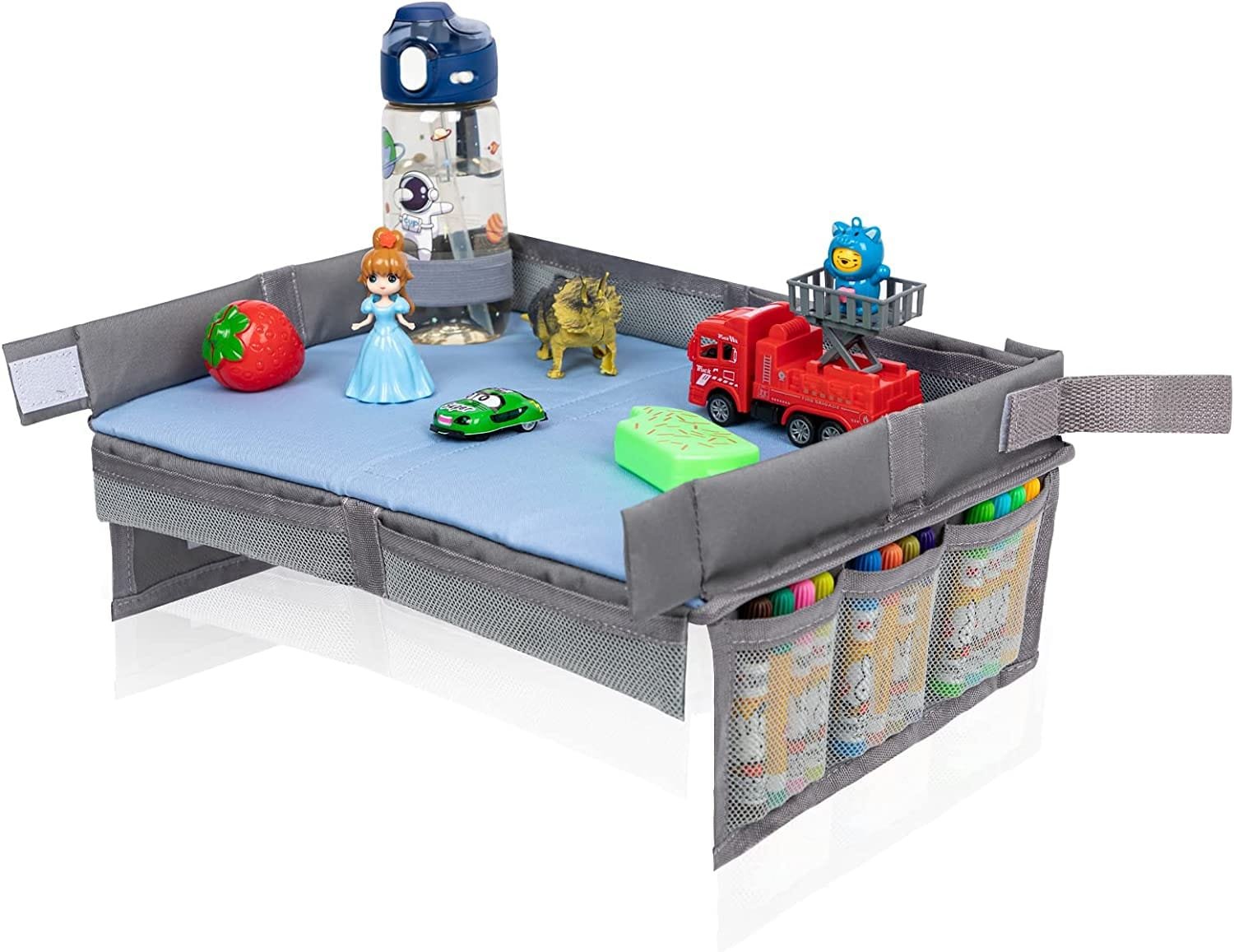GNEGNI Kids Travel Tray for Airplane, Foldable Travel Tray Cover Blue on Train Plane Travel Essentials, Toddlers Travel Tray Table Fit For Toys Snacks with Strap Tighten & Portable Storage bag