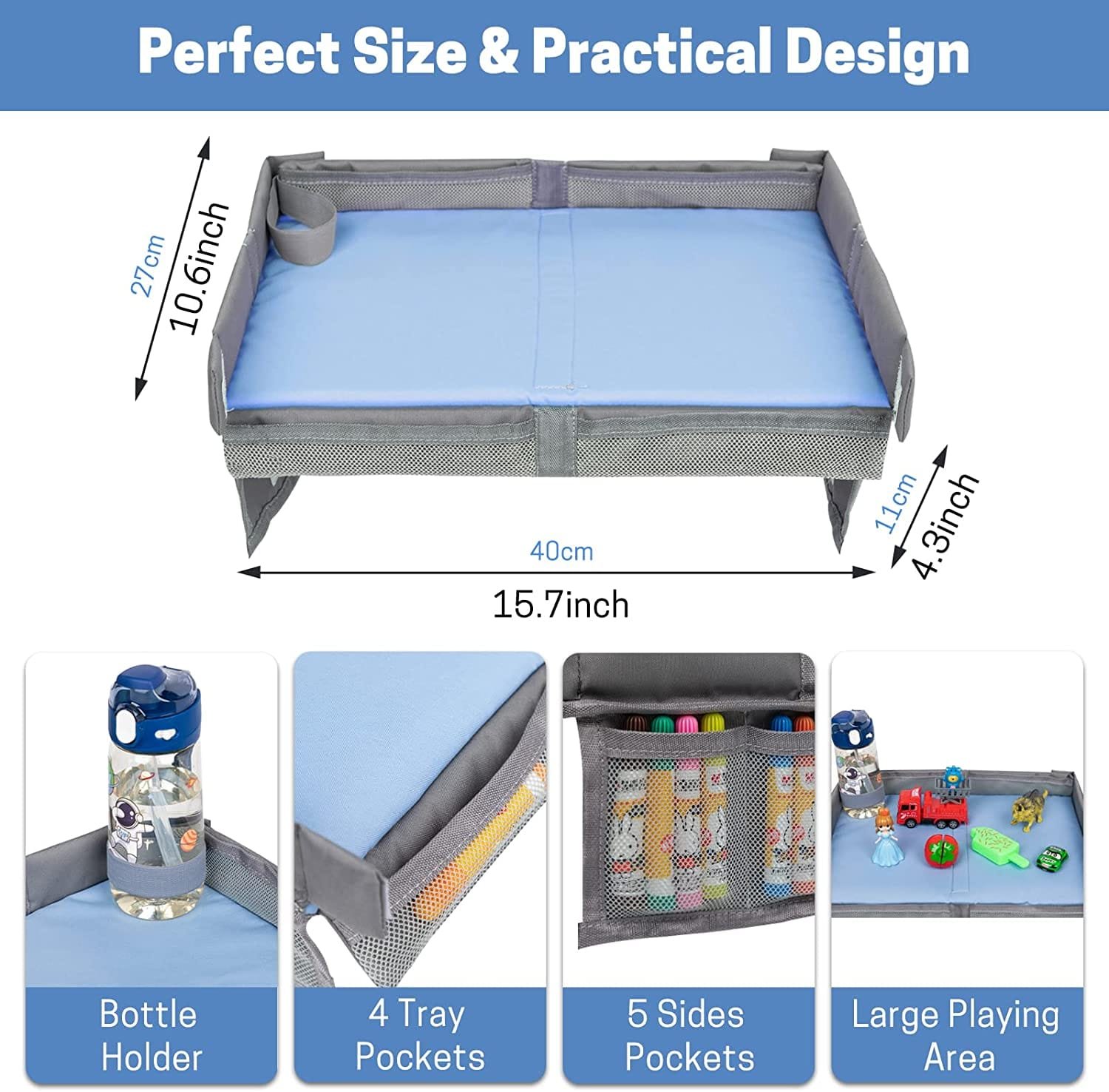 🙅‍ No More Lost Small Pieces: Kids travel tray cover completely closed all-around design, with 5 mesh pockets and 4 small long strip nets & bottle holder, make the snack, toys well organized. Additionally, just tighten the strap to the plane table to secure it, so nothing drops on the floor even if the plane is turbulence.