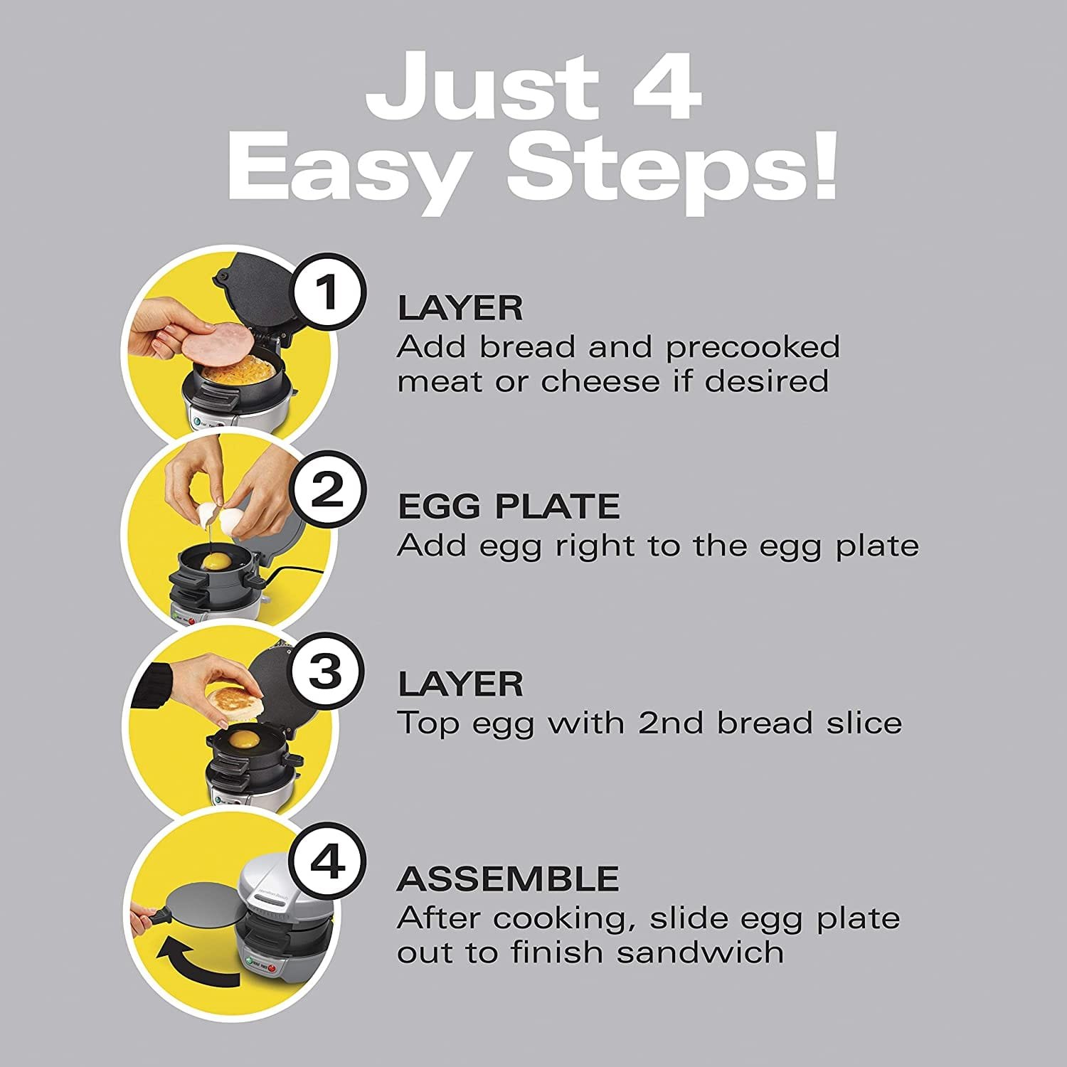 Forget the fast food drive-through. With the Hamilton Beach breakfast sandwich maker, you can enjoy a hot, homemade breakfast sandwich in under 5 minutes. Simply place the ingredients inside, build the base of your sandwich in the bottom layer, place the egg on the cooking plate and close the lid. Slide the cooking plate out and your sandwich assembles itself. Open the lid and your hot breakfast sandwich is ready to eat. The included recipe book provides a variety of breakfast sandwich options, from the traditional egg, ham and cheese to the unique cheddar, apple, bacon and egg croissant sandwich.