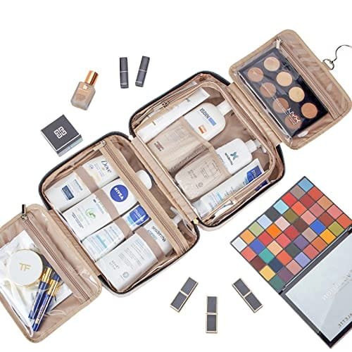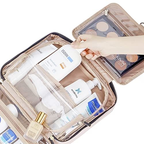 EASY TO GRAB-Special U-shape zippers design, take out the toiletries or zip up the toiletry case quickly. Multiple pouches and elastic bands. No more unpacking or digging through one bag and laying your stuff out on the bathroom counter. Just hang the bag up, grab what you need and put it back in the bag
