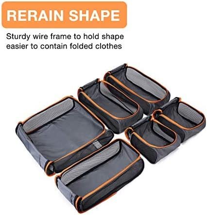 Hard Side Packing Cubes 6 Pcs – Large*1 + Medium*3 + Small*2. The suitcase organizers are surrounded by sturdy wire frames that will hold its shape while you packing your clothes. Which make it easier to contain folded clothes, make packing easier.